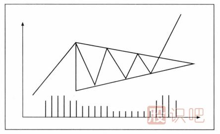 對(duì)稱三角形的形成過(guò)程:當(dāng)股價(jià)進(jìn)入盤整階段后,其波動(dòng)幅度逐漸縮小,即每次變動(dòng)的最高價(jià)低于前次的水平,最低價(jià)高于前次的水平,股價(jià)變動(dòng)領(lǐng)域的上限為向下的斜線,下限為向上的斜線,從而形成一個(gè)相對(duì)對(duì)稱的三角形,在此過(guò)程中成交量逐漸減少,多空雙方的力量對(duì)比趨于平衡。當(dāng)股價(jià)走到三角形頂部時(shí),多空雙方的力量對(duì)比發(fā)生變化,股價(jià)突破三角形區(qū)域,從而結(jié)束盤整狀態(tài)而繼續(xù)原先的走勢(shì)。