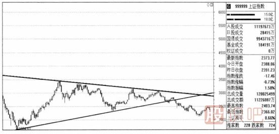 如上圖是2009-2012年上證指數(shù)軸線走勢(shì)圖,從圖中我們清楚地看到股指周線形成了一個(gè)很大的三角形形態(tài)。比較熟悉掌握三角形形態(tài)的投資者就可以判斷出,股指在2/3的位置并沒(méi)有形成向上突破,這時(shí)就應(yīng)該保持謹(jǐn)慎了。果然,在多次觸及三角形的上方突破未果之后,2011年股指展開(kāi)了大幅殺跌。