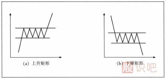 如上圖是矩形形態(tài)示意圖,其中左邊是上升矩形走勢(shì)圖,右邊是下降矩形走勢(shì)圖。需要注意的是,矩形形成過(guò)程中,成交量逐漸遞減,向上突破時(shí),需要有大成交量的配合,向下突破則沒(méi)有這種需求。此外,股價(jià)突破矩形形態(tài)后,其上漲或下跌的幅度至少為矩形本身的寬度。