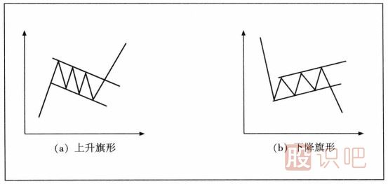 旗形走勢(shì)的形態(tài)就像掛在旗桿上的一面小旗,通常出現(xiàn)在快速大幅度的市場(chǎng)波動(dòng)中,是一種經(jīng)常出現(xiàn)的中段整理形態(tài)。一般來(lái)說(shuō),旗形又分為上升旗形和下降旗形。其中上升旗形是股價(jià)在經(jīng)過(guò)陡峭上升之后,進(jìn)入一個(gè)稍微向下傾斜的狹窄區(qū)域進(jìn)行整理,上下界限就是兩條向下傾斜的平行直線。而下降旗形是股價(jià)在急速下跌之后,進(jìn)入一個(gè)稍微向上傾斜的狹窄區(qū)域進(jìn)行整理,其上下界限也是兩條向上傾斜的平行直線。