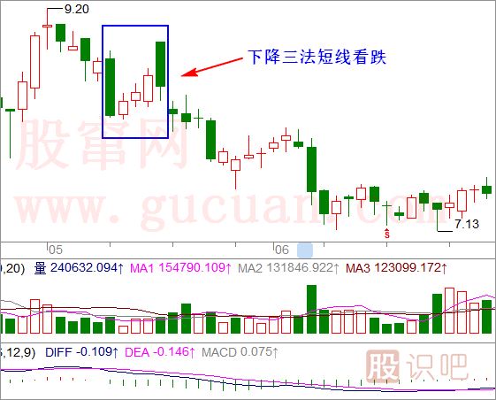 下降三法組合一般出現(xiàn)在行情下跌的過程當(dāng)中。出現(xiàn)大陰線之后,雖然連續(xù)拉出三根小陽線,但這只是對(duì)短線過急下跌速率的修正,因此反而是逢高減倉的好機(jī)會(huì),因?yàn)檎麄€(gè)跌勢(shì)仍未完結(jié),空方馬上會(huì)重新發(fā)難。在成交量方面的變化,該組合遠(yuǎn)不如上升三法組合表現(xiàn)得明顯。