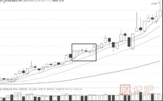 出現(xiàn)一根大陽線,說明多方已經(jīng)吹響了進(jìn)攻的號角。接下來卻連收三陰,這里有兩種情況,一是空方接連發(fā)難,試圖重新奪回主動權(quán),但連續(xù)三天也沒能擊穿大陽線的低點(diǎn),說明空方的力量并不強(qiáng)大,多方隨時都可以組織進(jìn)攻。另一種情況是多方故意而為的洗盤動作,之后出現(xiàn)的大陽線,標(biāo)志著短線調(diào)整已經(jīng)結(jié)束,上漲行情將得以延續(xù)。