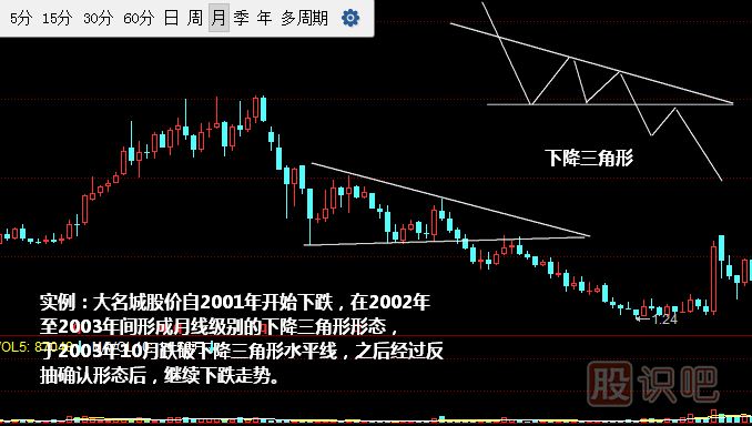 下降三角形形態(tài)K線圖下降三角形形態(tài)K線圖圖解實(shí)例:大名城股價(jià)自2001年開始下跌,在2002年至2003年間形成月線級別的下降三角形形態(tài),于2003年10月跌...