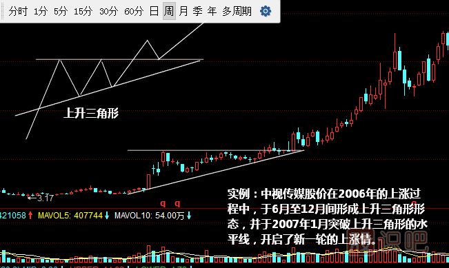 上升三角形形態(tài)K線圖上升三角形形態(tài)K線圖圖解實(shí)例:中視傳媒股價(jià)在2006年的上漲過程中,于6月至12月間形成上升三角形形態(tài),并于2007年1月突破上升三...