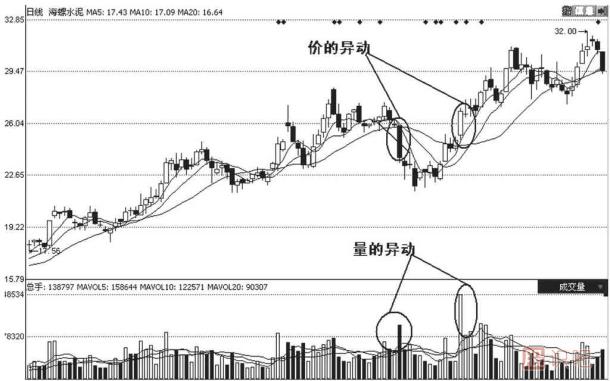 以海螺水泥(600585)的股價(jià)走勢圖為例來說明異動股的圖譜表現(xiàn)形式。如圖3-43中左側(cè)橢圓標(biāo)示的位置,在股價(jià)緩慢上升的途中,突然某天拉出一個(gè)大陽線配以巨量的成交量,或者在股價(jià)下降的途中,成交量一直處于萎靡甚至縮量的形態(tài),在某天突然出現(xiàn)一個(gè)巨量(如右面的圓圈)處,這都屬于從該股中捕捉到的異動情況。此外,判斷個(gè)股異動的情況的方法還有: