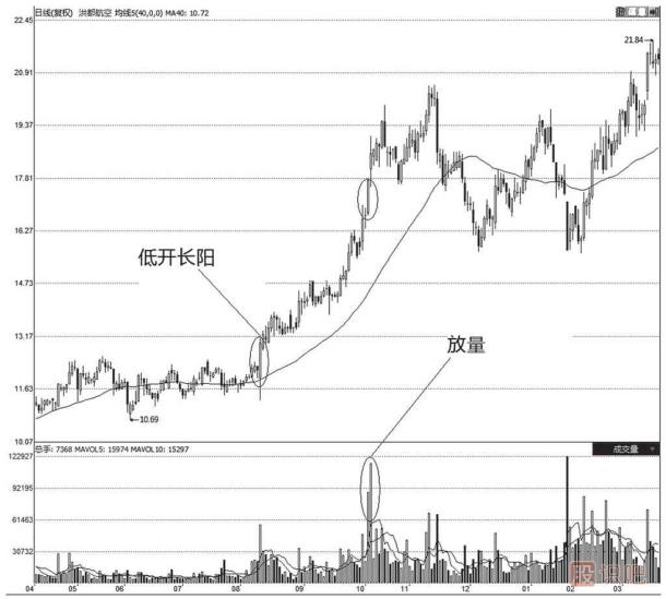 圖3-42為洪都航空(600316)2005年8月~2005年12月的股價(jià)走勢圖。從上圖可以看出股價(jià)在大幅上漲的過程中會出現(xiàn)各種各樣的異動情況。如該股在2005年8月10日出現(xiàn)低開長陽,之后的連續(xù)幾天都走出了陽線,移動均線也呈現(xiàn)發(fā)散的形態(tài)支撐該股的上漲,在2005年10月10日該股還出現(xiàn)了“十字星”的形態(tài),并且在2005年10月11日的時(shí)候又出現(xiàn)了放量上漲,當(dāng)日拉出長陽線,之后股價(jià)一路上升,創(chuàng)出股價(jià)新高10.95元,在短短兩個(gè)月的時(shí)間內(nèi)股價(jià)的漲幅近100%。