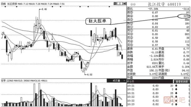 比如長江投資3270手委托單是圖中顯示委托單的平均5?6倍左右(如圖3-14所示),因此這筆單子就是一筆大單,它的存在對(duì)股價(jià)后期的波動(dòng)將會(huì)有重要的影響!在股價(jià)上漲的途中,如果在股價(jià)上方出現(xiàn)較大的委托賣單,股價(jià)運(yùn)行到此處不放量吃掉這筆大賣單,股價(jià)往往就會(huì)停止上漲;有的時(shí)候甚至還沒有漲到大賣單的價(jià)位處股價(jià)便停止了上漲。如果股價(jià)在此時(shí)想漲上去,一是放量吃掉大賣單,再就是這筆大賣單主動(dòng)撤掉。