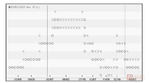 在我們使用的看盤圖表中,常見的技術(shù)圖表主要包括K線圖、柱狀圖、收盤價(jià)線圖、點(diǎn)數(shù)圖。據(jù)考證,股市交易者最早使用的是點(diǎn)數(shù)圖技術(shù)。維克托·德維利爾斯在1933年出版的《點(diǎn)數(shù)圖預(yù)測(cè)股價(jià)方法》一書中首次提及點(diǎn)數(shù)圖。點(diǎn)數(shù)圖中"X"形狀組成的列表示價(jià)格上升,"O"形狀組成的列表示價(jià)格下降。只需要用到最高價(jià)、最低價(jià)就可以畫出點(diǎn)數(shù)圖,如圖1-1所示。但是現(xiàn)在很少有人使用這一圖表,且很多看盤軟件不再提供這種看圖方法。