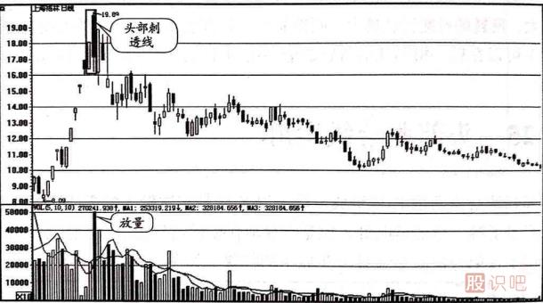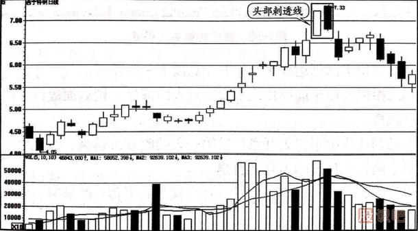 (3)在頭部刺透線出現(xiàn)后,股價(jià)一旦出現(xiàn)重心下移并跌破第一根陰線的開盤價(jià)就是果斷賣出的信號。