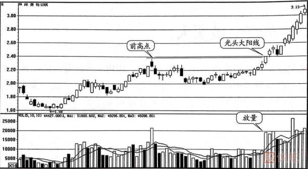 (1)在沖過(guò)前一個(gè)高點(diǎn)時(shí)應(yīng)放出較大的成交量,可以是單根的放量陽(yáng)線,也可以延伸為放量的幾根陽(yáng)線,總之,在突破前高點(diǎn)時(shí)要有放大的成交量配合。
