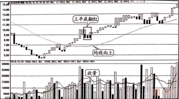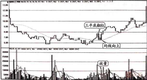 周線級別中的寶塔線三平底翻紅意味著做空能量得到了充分的釋放,股價(jià)不再下跌,只是在底部小幅波動,波動結(jié)束后,就會結(jié)束下跌,進(jìn)人上升的行情。一旦寶塔線在成交量的配合下開始翻紅,說明股價(jià)重新開始上漲,投資者應(yīng)及時(shí)果斷買入。