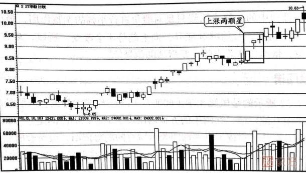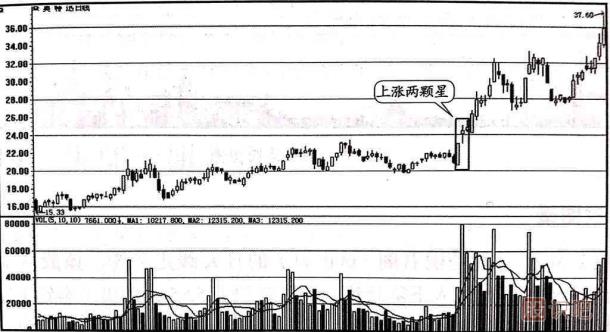 上漲兩顆星屬于常見的上漲中繼形態(tài),一般出現(xiàn)在大行情的初期。 大陽線之后連續(xù)出現(xiàn)勢均力敵的信號意味著多空雙方的力量在新的條件下取得了平衡,空方沒有打壓股價的力量,多方的勝利被鞏固了,投資者對股價的上漲已經取得了共識,大陽線取得的成果已經得到市場的認同,這往往是股價大幅度攀升的先兆。