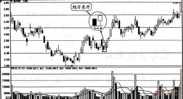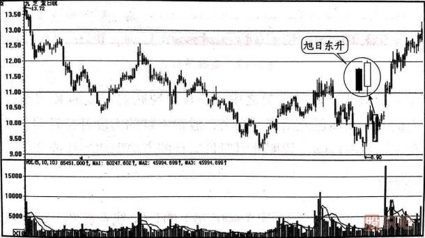 旭日東升屬于底部反轉(zhuǎn)信號,下跌趨勢中股價經(jīng)過連續(xù)下挫,空頭能量已經(jīng)釋放殆盡。 在空方無力繼續(xù)打壓時,多方奮起反擊,股價高開高走,前景又開始變得光明起來。 旭日東升中的陽線實體高出陰線實體的部分越多,轉(zhuǎn)勢信號越強,投資者看到出現(xiàn)旭日東升后,不宜繼續(xù)看空做空,而要逢低吸納。