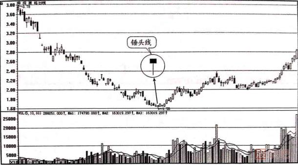 如圖1-10所示的是深賽格(000058)的日k線走勢圖。該股從前期的高點3.78元快速下跌至1.58元,當(dāng)天收出一根下影線較長的錘頭陰線,并且成交量有微幅的放大,說明在此位置下檔支撐強勁,有多頭開始在逐漸地買入,表明后市上漲的概率較大。 此時投資者還不能立即買入,還要觀察后面股價的走勢。隨后股價重心不斷上移,說明股價回升的態(tài)勢已經(jīng)形成,這時才是投資者適量分批介入的時機。