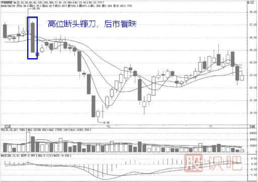 斷頭鐮刀斷頭鐮刀圖形特征由1根K線和3根移動(dòng)平均線組成,大陰線向下穿過3根平均線,收盤價(jià)低于這3根平均線。實(shí)戰(zhàn)含義高位斷頭鐮刀,后市...