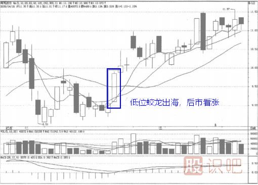 蛟龍出海蛟龍出海圖形特征由1根K線和3根移動(dòng)平均線組成,大陽(yáng)線向上穿過3根平均線,收盤價(jià)高于這3根平均線。實(shí)戰(zhàn)含義低位蛟龍出海,后市...