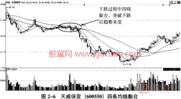 如圖2一6所示,在天威保變的日K線中,均線黏合的地方是在下跌趨勢(shì)中。圖中顯示的四條均線黏合之后,股價(jià)下跌的趨勢(shì)并沒(méi)有發(fā)生轉(zhuǎn)變。而是沿著原來(lái)的趨勢(shì)繼續(xù)運(yùn)行了下去。黏合的均線只不過(guò)是為進(jìn)一步的下跌創(chuàng)造了條件,下跌中均線由黏合轉(zhuǎn)為發(fā)散,恰好是進(jìn)一步下跌的開(kāi)始。