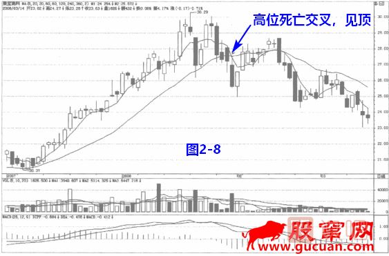 見圖2一8,股價(jià)經(jīng)過長期的上漲,已出現(xiàn)明顯的滯漲行情,此時(shí)出現(xiàn)均線死亡交叉,要引起重視,下跌后股價(jià)無力冉向上拉起,投資者應(yīng)果斷離場,將前期所賺的利潤先落袋為安的好。