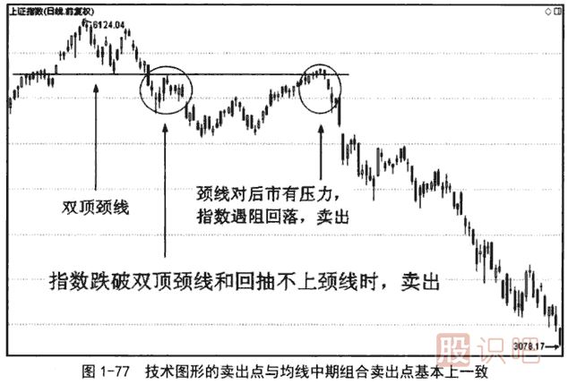 圖1-77是與圖1-76同一時間段的日線圖。在圖1-76中,跌破60日均線的大陰線同時也跌破了雙頂?shù)念i線。雙頂是轉(zhuǎn)勢技術(shù)圖形,有效跌破頸線應(yīng)賣出。跌破雙頂頸線后又回抽了一下頸線,回抽頸線不上,應(yīng)當(dāng)繼續(xù)賣出。