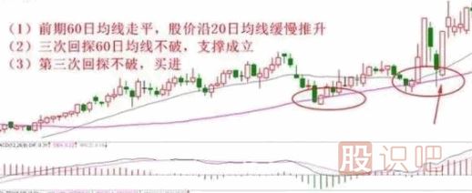 操作方法:個(gè)股在長(zhǎng)期下跌后,股價(jià)第一次站上60均線,急進(jìn)的投資者可以跟進(jìn),穩(wěn)健的投資者可以等到股價(jià)洗盤(pán)回調(diào)到60均線附近區(qū)域得到支撐買(mǎi)入,極其準(zhǔn)確。