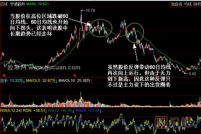 60日均線是股價的生命線,如果生命線被跌破則意味著下降空間被打開。對于股指來說,當指數(shù)跌破日平均線后,意味著大盤下跌空間已經(jīng)打開,下跌趨勢形成。但由于股指是由所有個股價格加權(quán)統(tǒng)計后產(chǎn)生的,而個股價格卻有很大的差異。當大部分個股股價跟隨大盤走勢相繼跌破60日均線時,有些個股股價仍能停留在60日均線之上,我們所說的強勢股,就是指這部分股票。而這些強勢股會在大盤跌勢結(jié)束后,新的上升行情開始時率先啟動,成為新一輪行情中的黑馬。