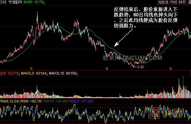 觀察圖4,從中看到,60日均線再次掉頭向下時,股價一路下滑。雖然期間有所反彈,但此時的60日均線不再成為股價的支撐,而成為強烈的反壓,每當股價反彈至60日均線附近時便繼續(xù)向下跌落。對于短線投資者來說,如果在下跌途中搶反彈,就要在股價反彈至60日均線附近時及時拋出;對于中長線投資者來說,應繼續(xù)場外觀望。