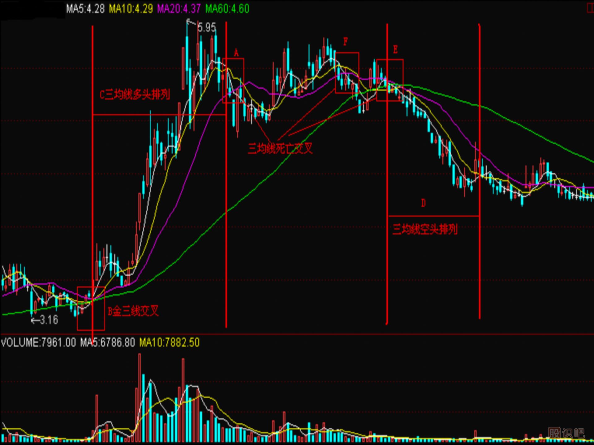 D處是在死亡三線交叉后,三均線的空頭排列。B處是金三線交叉,這是買進點的好機會。之后三均線呈多頭排列。