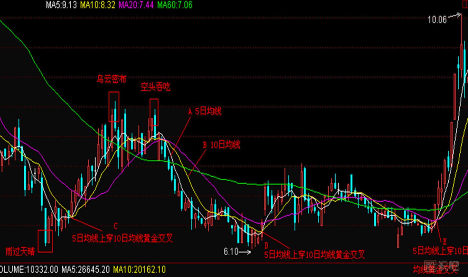 A處是5日移動平均線,在價格頭部第1個掉頭向下,出現(xiàn)拐點和賣點。