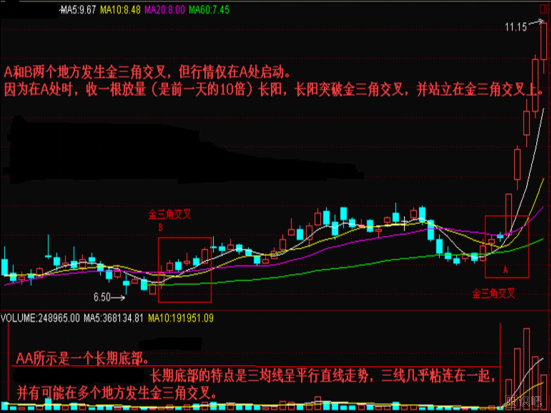注意:金三線交叉在實際的價格走勢中經常出現(xiàn),一旦出現(xiàn)金三線交叉并伴隨有成交量放大,投資者要立刻大膽進場。