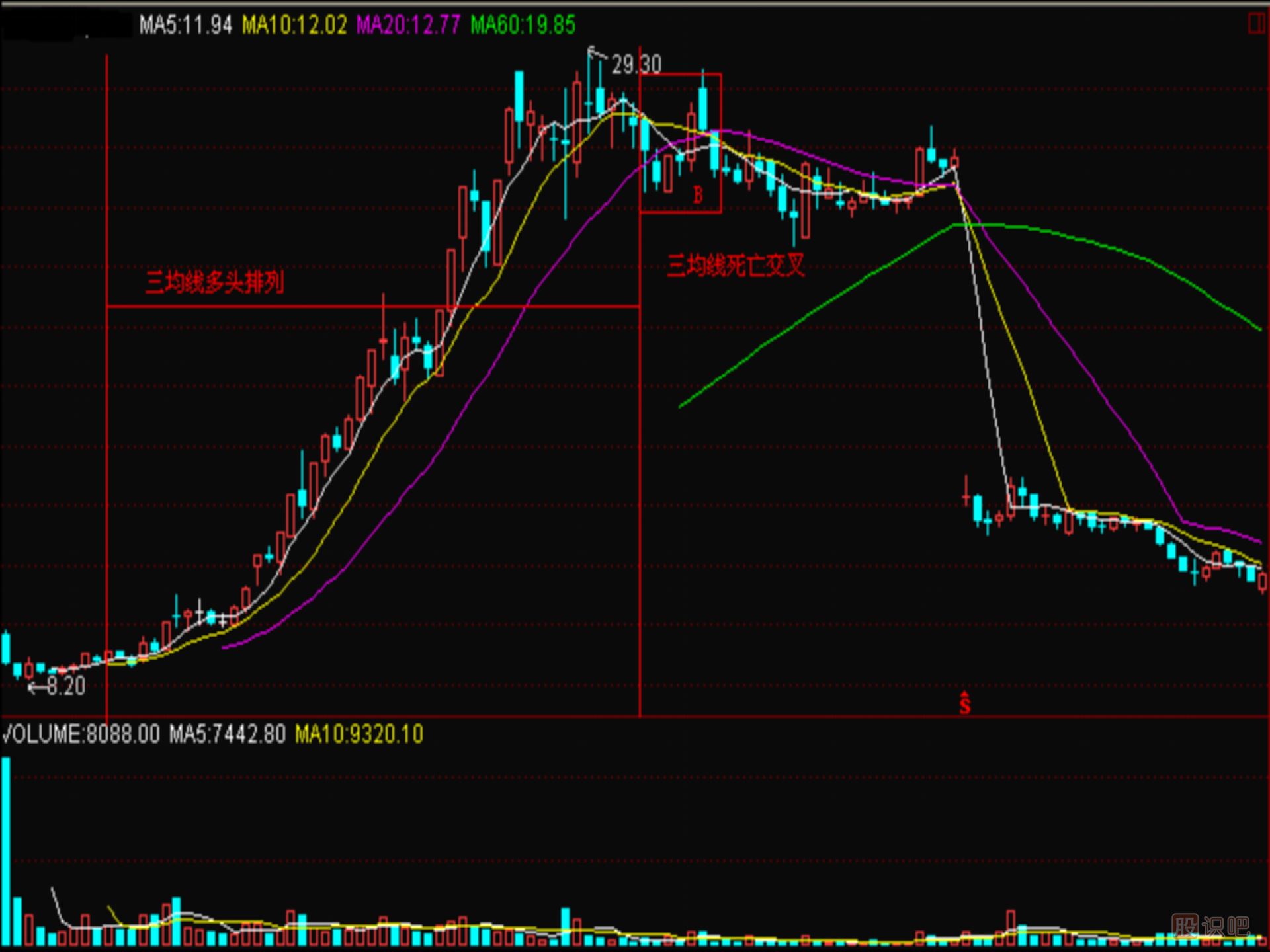 原因:它又加上一條20日均線(月均線),把短期的振蕩除掉。只有經過一個真正的頭部才能產生死亡三角交叉。