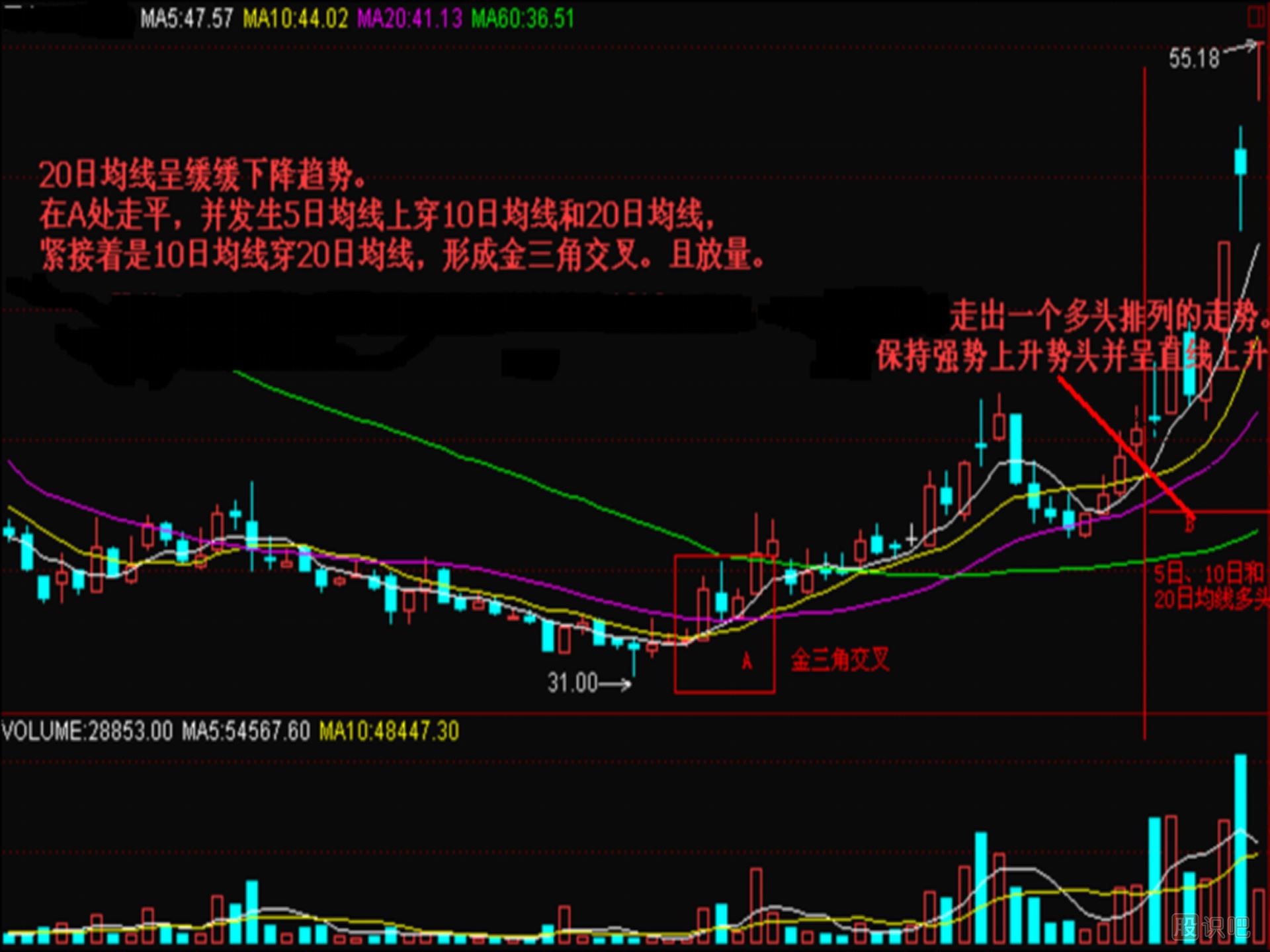 2)金三角交叉的有效性和可靠性大于5日和10日的黃金交叉,加上一條20日均線,把短期的振蕩除掉。