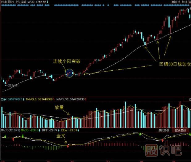 上證指數(shù)于2015年2月26日、27日和3月2日連續(xù)3個(gè)小陽(yáng)線突破30日線,成交量同步放大,MACD在0軸附近同步金叉,之后上證指數(shù)從3000點(diǎn)上漲至5178點(diǎn),帶來(lái)一波收益很棒的牛市行情。