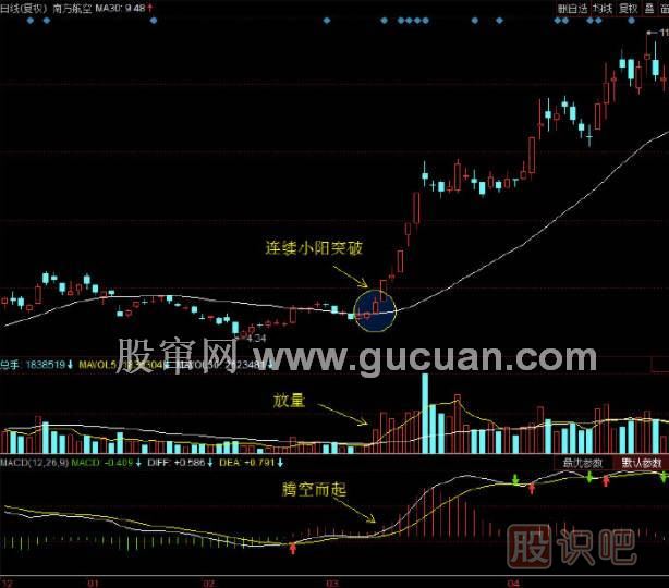 若僅僅是一個(gè)小陽(yáng)突破,則該股后續(xù)爆發(fā)力還要看其他方面。但若連續(xù)幾個(gè)小陽(yáng)的上漲,則威力就發(fā)生變化。簡(jiǎn)單理解就是幾個(gè)連續(xù)小陽(yáng)組成了一個(gè)大陽(yáng)線,其原理就變成了中/大陽(yáng)線突破,短期該股爆發(fā)力同樣很強(qiáng)。