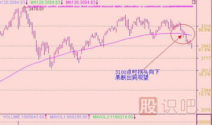 這里一點非常重要,很多主力操盤手大多以120日均線為進(jìn)退依據(jù),當(dāng)趨勢線一旦拐頭向下,大級別的調(diào)整即將到來,此時必須出局觀望。
