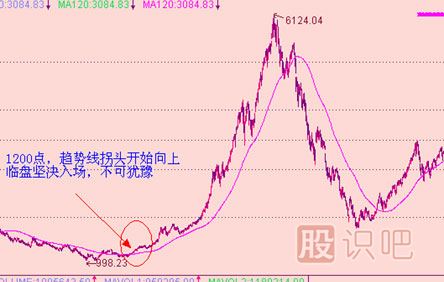 A股經(jīng)過暴跌之旅,2005年11月份,大盤趨勢線拐頭開始向上,此時大盤大約1160點,此時投資者可以果斷入場,不要有任何猶豫。后市行情最高發(fā)展到6124點。