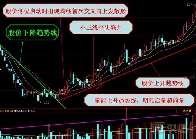 通過上面兩個技術(shù)圖形講解,投資者可以清楚的了解,均線空頭陷井之后,小三線會再次形成多頭排列向上發(fā)散走勢。并且均線空頭陷井的下方,均線出現(xiàn)過底部反轉(zhuǎn)信號,如低位銀山谷、低位均線交叉向上發(fā)散或粘合向上發(fā)散的走勢。并且可以得出結(jié)論,均線空頭陷井屬于典型的誘空信號,一旦在股價(jià)構(gòu)筑底部上漲初期出現(xiàn)或上升趨勢途中出現(xiàn),后市股價(jià)慣性上漲的概率非常高。