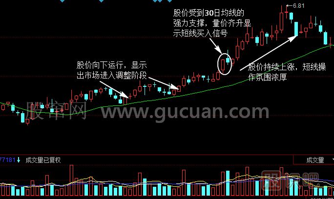 圖中透露了股價中期趨勢的轉(zhuǎn)變,其轉(zhuǎn)折點就是股價放量突破30日均線時,由此形成了股價中期向上的趨勢。把握住股價的中期上漲走勢,投資者大可以在股價回調(diào)低位時大膽進(jìn)行短線買入操作。