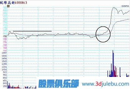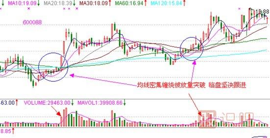 第二,股價需放量突破均線密集纏繞。這點是關(guān)鍵,均線走平意味著多空勢均力敵,多為主力在此吸籌階段。放量突破意味主力拉升股價已經(jīng)啟動,打蛇打七寸,這個地方買進(jìn)是掐住了股價啟動的時空關(guān)鍵點。