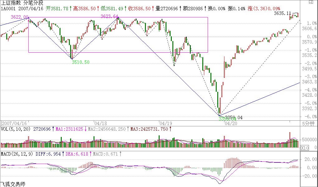后面的走勢(shì)很簡(jiǎn)單,關(guān)鍵是那中樞,由于分筆背馳只保證回抽到下跌最后一個(gè)反彈處,收盤(pán)已達(dá)到,而分筆背馳并不100%支持對(duì)該中樞的完全回拉,所以理論上,依然完全存在繼續(xù)跌出一個(gè)更大級(jí)別的背馳再回拉的可能,當(dāng)然,也可以直接上去,這必須由市場(chǎng)來(lái)選擇。但無(wú)論哪種情況,該中樞都是一個(gè)新的中樞形成前的判斷關(guān)鍵。而420當(dāng)天中樞的位置,就決定了今后走勢(shì)可能的演化。