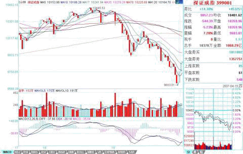 對(duì)于一個(gè)跌破中樞的下跌來(lái)說(shuō),第三類(lèi)賣(mài)點(diǎn)后再來(lái)兩波就可以隨時(shí)完美。這個(gè)完美,由于該下跌是1分鐘以下級(jí)別的,因此從該下跌的細(xì)部,是找不到根據(jù)1分鐘背弛去確認(rèn)的買(mǎi)點(diǎn)的,只可能根據(jù)分筆背馳。而根據(jù)預(yù)先知道的中樞震蕩看法,唯一需要確認(rèn)的是,1330后的下跌與1030前下跌的力度比較。從5分鐘MACD兩柱子面積的比較可以看到,前者并不比后者的力度大,這一點(diǎn),參考看深圳成指的圖就更明顯了(請(qǐng)看下圖)。所以,可以斷言,這1330開(kāi)始的下跌,一定會(huì)有強(qiáng)力回拉。