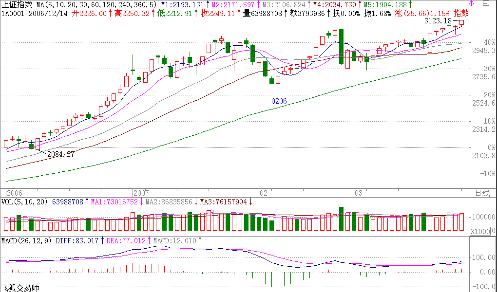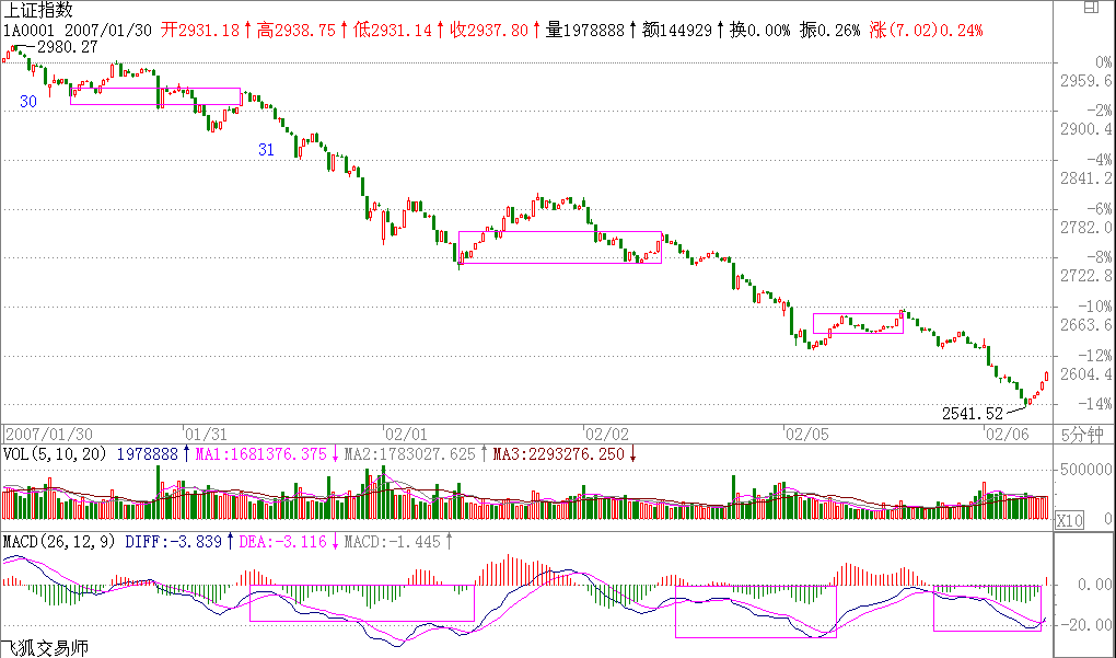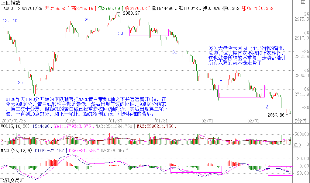 今天的走勢(shì)十分標(biāo)準(zhǔn)規(guī)范,只要對(duì)本ID的理論有一點(diǎn)了解的,都不難找到這個(gè)5分鐘背馳的底部。目前的事情很簡(jiǎn)單了,5分鐘背馳,一個(gè)大的阻力就是2720,這是上次的低點(diǎn),如果能上去,那周線的第一段就不會(huì)演化成下跌的趨勢(shì)(2007-02-02 15:20:44 這輪牛市的第一段都沒走完,什么叫基本走完?一個(gè)周線的調(diào)整很正常,又不是今天才說的。這個(gè)調(diào)整的級(jí)別最多就是去年5月到8月那個(gè),8月以后是什么?),一個(gè)2720上下的周線中樞將逐步形成,否則,就有在下面形成下跌的第二個(gè)中樞的可能,這樣走勢(shì)壓力就比較大