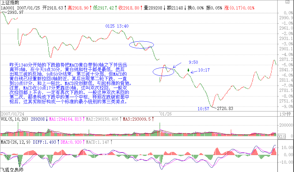 各位看好了,本ID分析給大家看。昨天1340分開始的下跌趨勢(shì)把MACD黃白帶到0軸之下并遠(yuǎn)遠(yuǎn)離開0軸,在今天9點(diǎn)30分,黃白線和柱子都是最低,然后出現(xiàn)三波的反抽,9點(diǎn)50分結(jié)束,第三波十分弱,但MACD的黃白線已經(jīng)重新拉回0軸附近,其后出現(xiàn)第二輪下跌,一直到10點(diǎn)57分,和上一輪比,MACD沒創(chuàng)新低,引起標(biāo)準(zhǔn)的背馳。注意,MACD在10點(diǎn)17分更靠近0軸,這叫雙次拉回,一般雙次拉回都上不去,一定有再次下跌的。一般這種雙次來回的第二次,都是構(gòu)成下跌中的第一個(gè)中樞,特別在跌破前面中樞后,這其實(shí)剛好構(gòu)成一個(gè)標(biāo)準(zhǔn)的最小級(jí)別的第三類賣點(diǎn)。