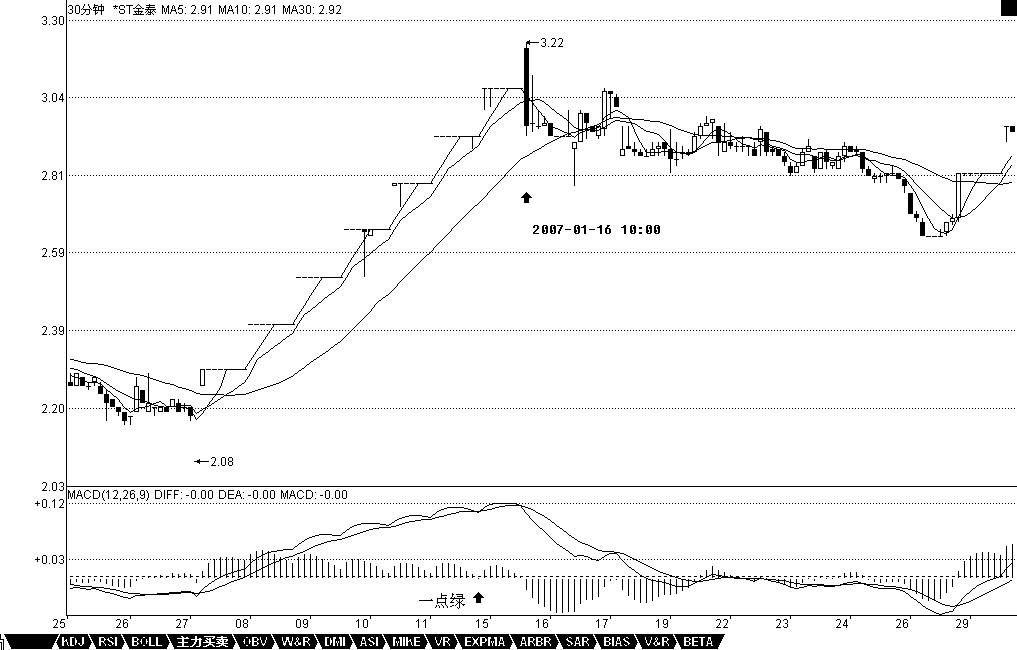 還有一種,就是股票不斷一字漲停,這時候,由于MACD設(shè)計的弱點,在1分鐘、甚至5分鐘上,都會出現(xiàn)一波一波類似正弦波動的走勢,這時候不能用背弛來看,最簡單,就是用1分鐘的中樞來看,只要中樞不斷上移,就可以不管。直到中樞上移結(jié)束,就意味著進入一個較大的調(diào)整,然后再根據(jù)大一點級別的走勢來判斷這種調(diào)整是否值得參與。如果用MACD配合判斷,就用長一點時間的,例如看30分鐘。一般來說,這種走勢,其紅柱子都會表現(xiàn)出這樣一種情況,就是紅柱子回跌的低點越來越低,最后觸及0軸,甚至稍微跌破,然后再次放紅伸長,這時候就是警告信號,如果這時候在大級別上剛好碰到阻力位,一但漲停封不住,出現(xiàn)大幅度的震蕩就很自然了。例如600385,在2。92那漲停,MACD出現(xiàn)一點的綠柱子,然后繼續(xù)漲停,繼續(xù)紅柱子,而3。28元是前期的日線高位,結(jié)果3。22漲停一沒封住,就開始大幅度的震蕩。