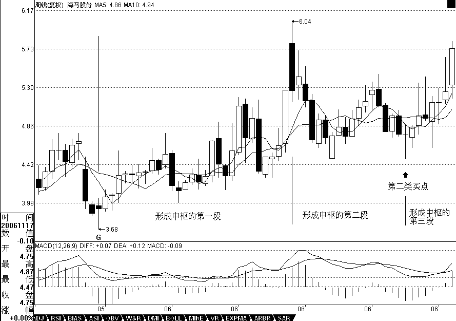 必須注意,MACD在0軸附近盤整以及回抽0軸所形成的中樞,不一定就是相應(yīng)級別的中樞,而是至少是該級別的中樞。例如日線MACD的0軸盤整與回拉,至少構(gòu)成日線的中樞,但也可以構(gòu)成周線的中樞,這時候就意味著日線出現(xiàn)三段走勢。