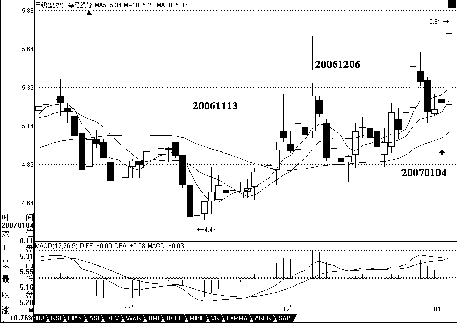 用最近漲得最厲害的一個股票來說明,000572。該股票的力度,其實是和他在日線與周線上出現(xiàn)雙重的第二類買點有關(guān),相應(yīng)地,就有了MACD雙重在0軸停留形成第一個中樞的情況。在周線上,該股從20051209到20060714,形成第一段,同時MACD也回到0軸上面。其后就開始形成第一個中樞,最終在20061117形成第二類買點,同時,黃白線在0軸附近橫盤。然后,開始逐步擺脫該中樞,黃白線也逐步拉起。在日線上,這個過程也是一樣的, 20061113到20061206,形成日線上的第一段,同時MACD回到0軸上面。然后三段回拉在20070104結(jié)束,形成第一個中樞,其后突破中樞,MACD在0軸附近拉起,擺脫第一個中樞。該股以后的走勢就很簡單了,首先形成一個至少是日線級別的新中樞,同時MACD回抽0軸,然后再突破,出現(xiàn)背馳,構(gòu)成一個大調(diào)整,從而導(dǎo)致一個至少周線以上級別的中樞,使得MACD出現(xiàn)回拉0軸,然后再拉起來,出現(xiàn)背馳,其后的調(diào)整就大了去了,至少是月線級別的。