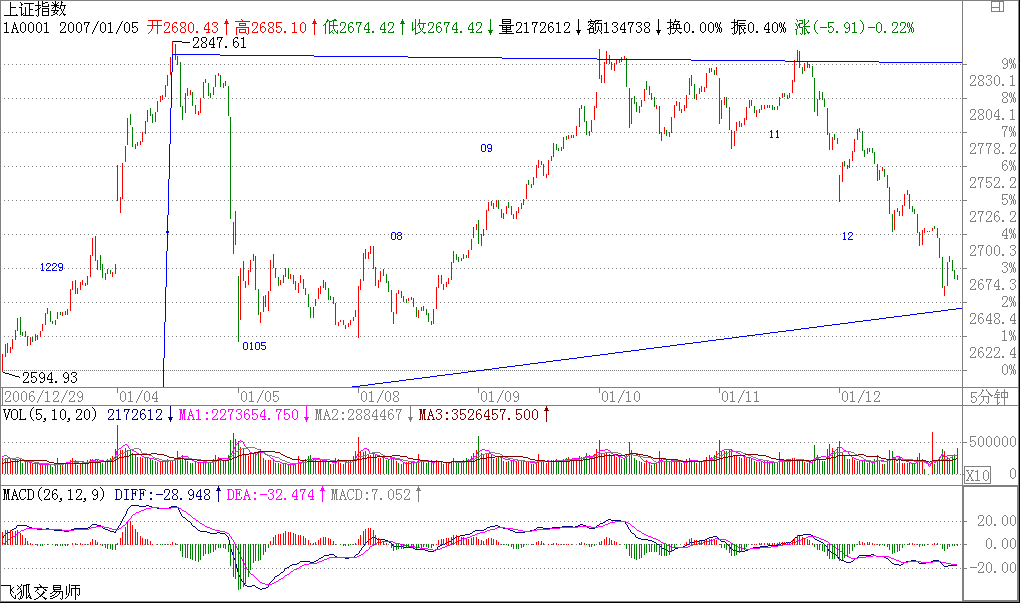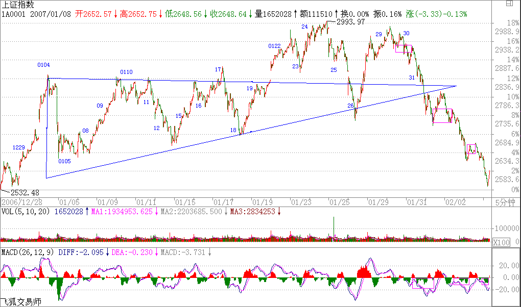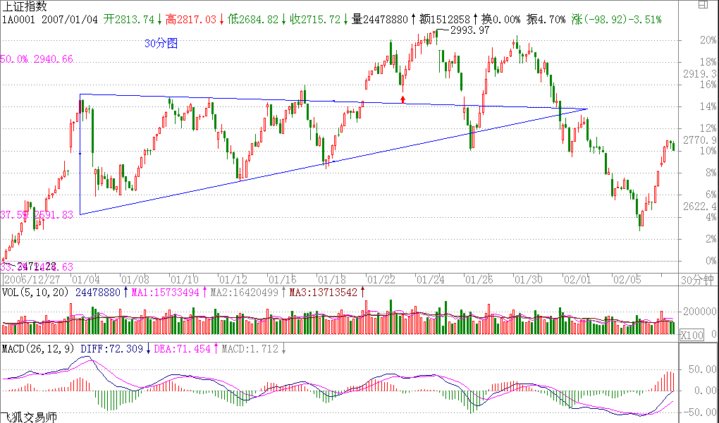 今天的走勢,都看到了,就是一個漢奸殺跌的過程,技術(shù)上很簡單,就是演化為一個復(fù)雜的調(diào)整.這在技術(shù)上是很正常的,理由前面已經(jīng)說了,三角形后往往就是最后一段,但這只是30分鐘級別背馳引發(fā)的調(diào)整,2700點上下的中樞位置的波動就是所有了.