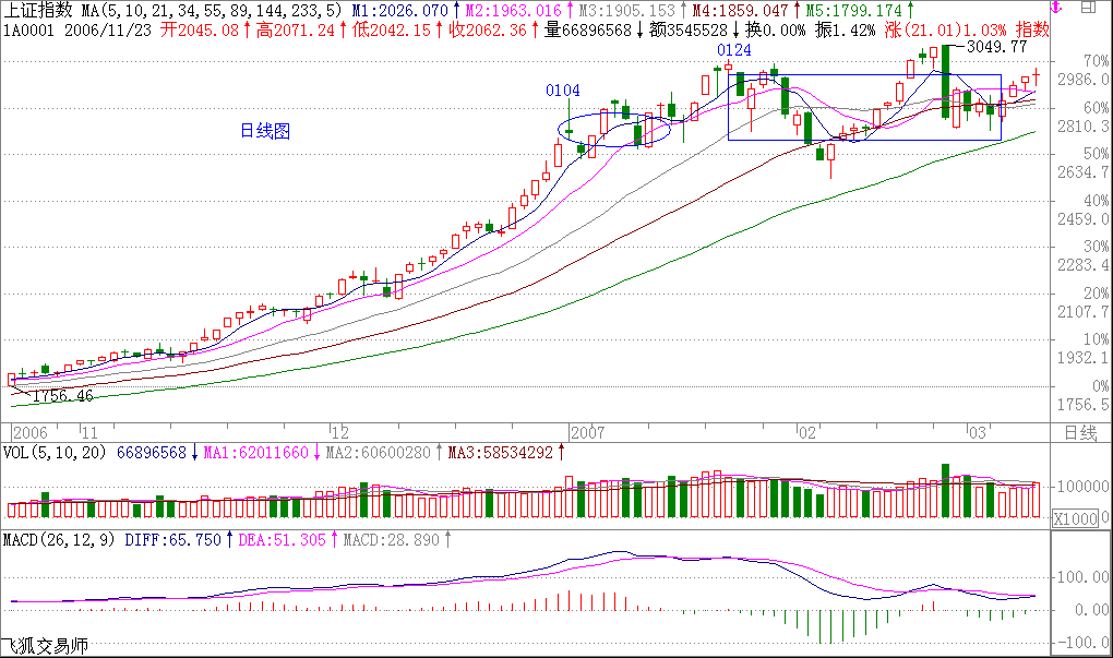 必須提醒,三角形一般是一段走勢的最后一個調(diào)整中經(jīng)常出現(xiàn)的,因此,三角形出現(xiàn)后,其后的走勢就要時刻小心了。當(dāng)然,這只是對30分鐘而言,而日線上要出現(xiàn)大調(diào)整,還早著。所以,密切關(guān)注30分鐘或60分鐘的圖形,一旦出現(xiàn)背馳,就可以打點短差了。