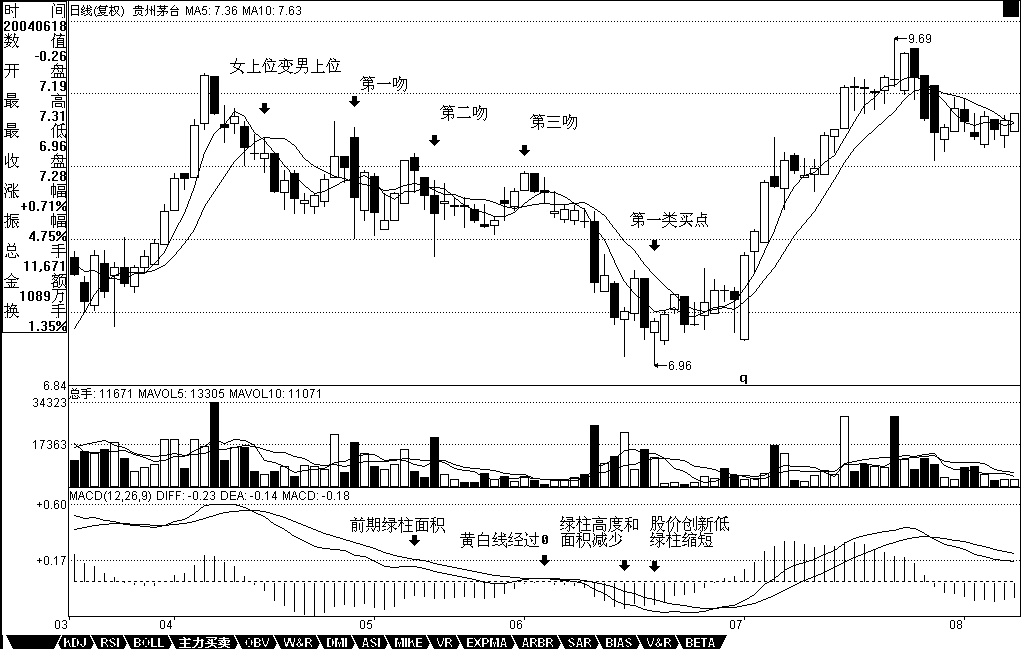 對(duì)于茅臺(tái),2004年6月4日那周出現(xiàn)女上位后第一吻,對(duì)應(yīng)在日線圖上是明顯的男上位走勢,該走勢其中出現(xiàn)三次吻,分別在2004年4月29日、5月18日、6月1日,都是典型的濕吻,但前兩次其后的下跌都沒有出現(xiàn)背馳,只有第三次,出現(xiàn)明顯的背馳性走勢,6月18日創(chuàng)下低點(diǎn)后,MACD的綠柱子明顯比前面的要縮短,這就構(gòu)成了日線上的第一類買點(diǎn),而這個(gè)買點(diǎn),在周線上就是第二類買點(diǎn)。注意,后面由于除權(quán),價(jià)位上似乎比這個(gè)要低了,其實(shí)并沒有。